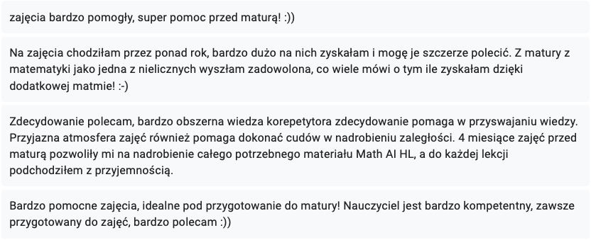 Z największą przyjemnością publikuję opinie i wyniki moich uczniów z ostatnich lat: